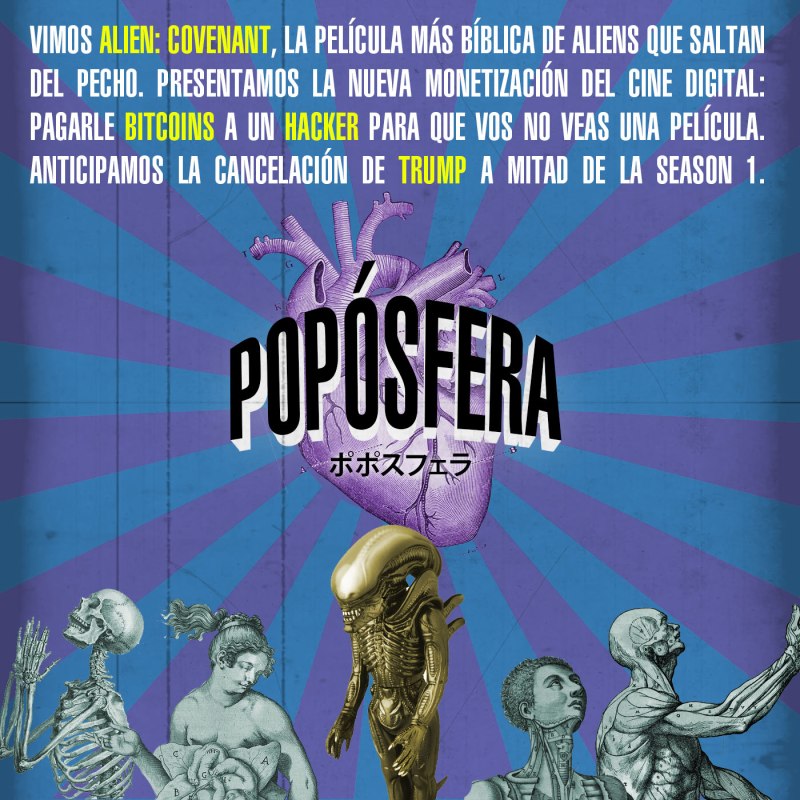 Vimos Alien: Covenant, la película más bíblica de aliens que saltan del pecho. Presentamos la nueva monetización del cine digital: pagarle bitcoins a un hacker para que vos no veas una película. Anticipamos la cancelación de Trump a mitad de la season 1.