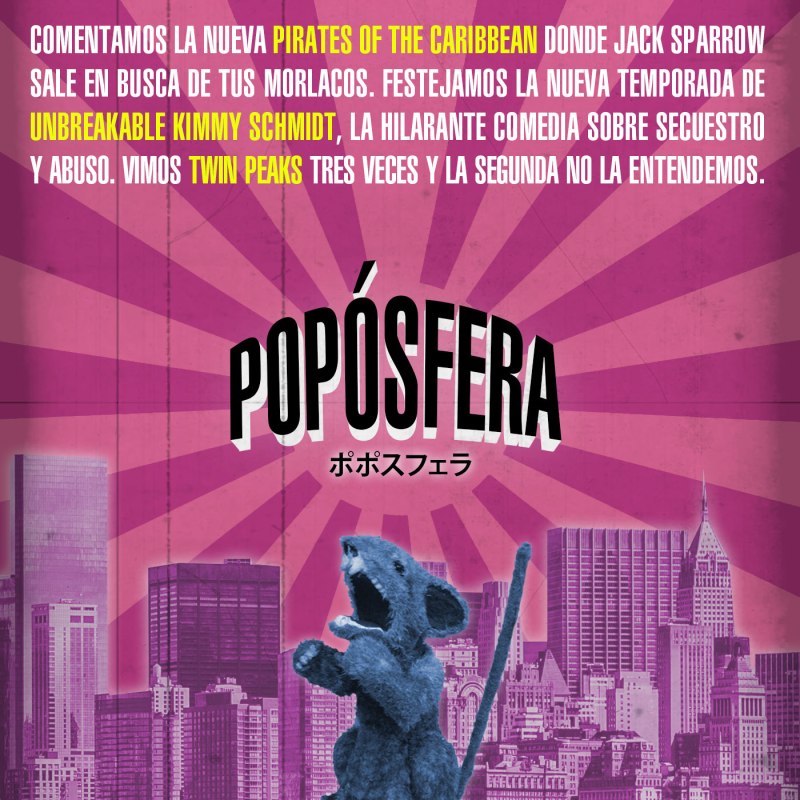 Comentamos la nueva Pirates of the Caribbean donde Jack Sparrow sale en busca de tus morlacos. Festejamos la nueva temporada de Unbreakable Kimmy Schmidt, la hilarante comedia sobre secuestro y abuso. Vimos Twin Peaks tres veces y la segunda no la entendemos.